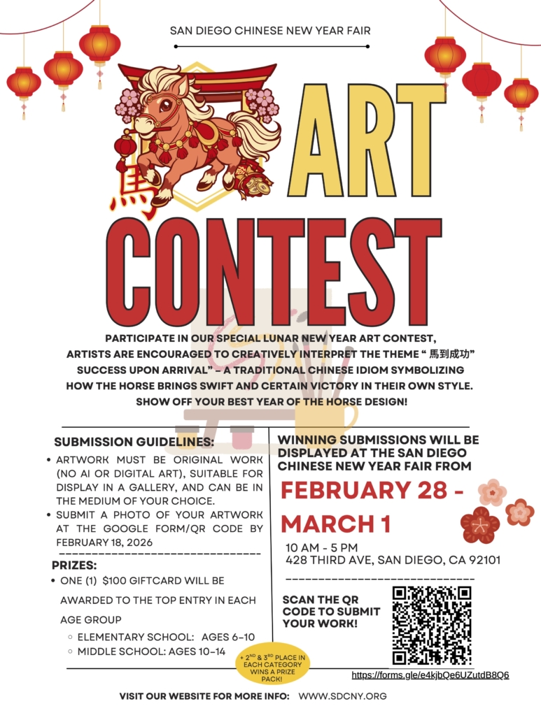 Accepted entries will be displayed at the CCBA Historic Building Gallery during the annual San Diego Chinese New Year Fair from February 28 – March 1 and top entries in each category will be awarded a $100 gift card.